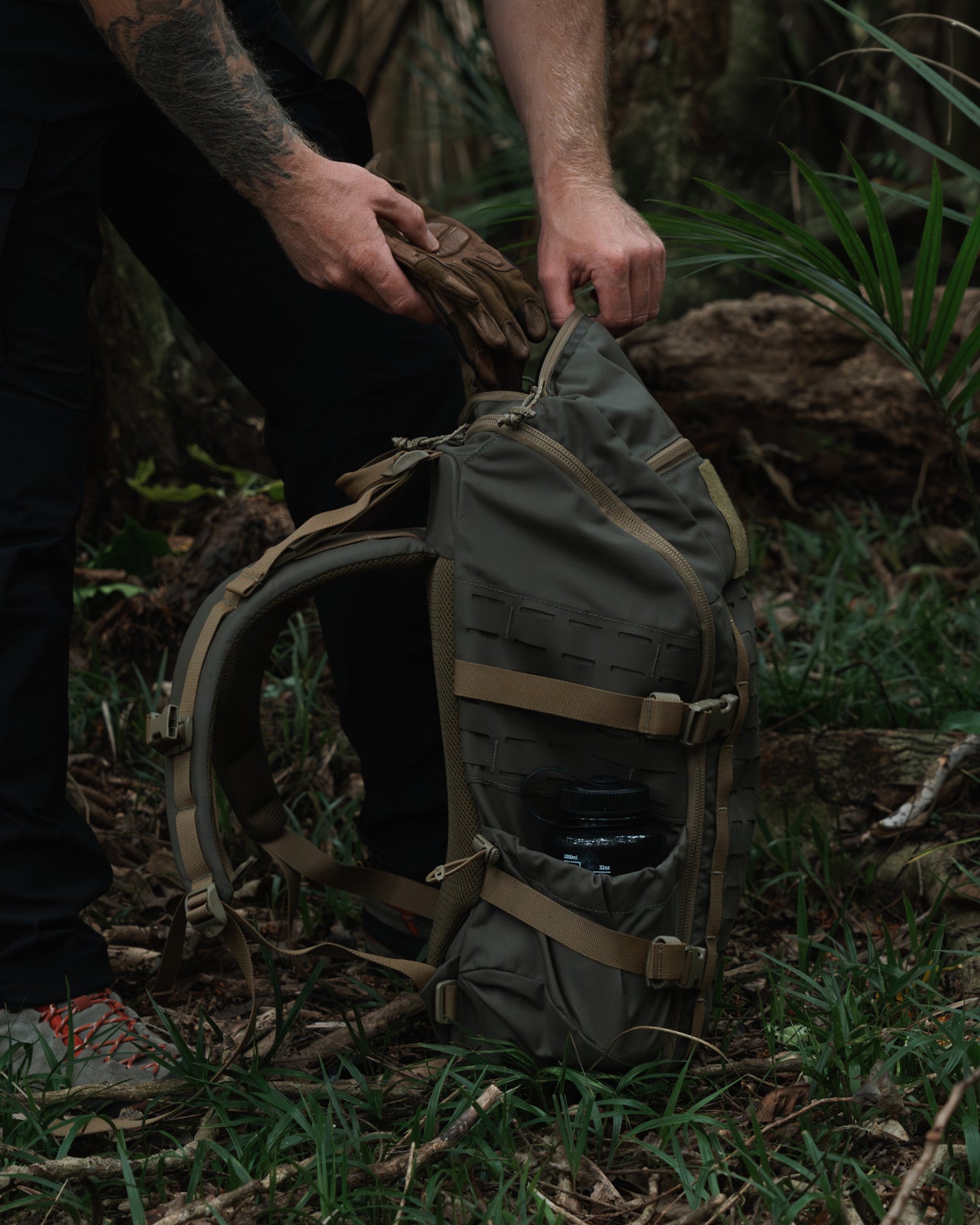 an infantryman setting up a mission-ready load out,